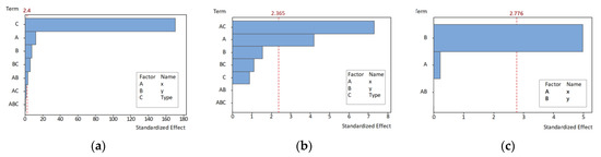 Pareto charts of the standardized effects: (a) Size deviation; (b) cylindricity; (c) coaxiality.