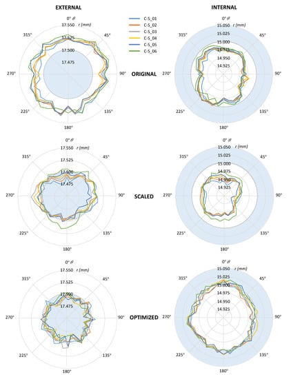 Deviations along the 45–225° direction were slightly higher than those along the 135–315° direction. Moreover, a tendency to higher deviations corresponding to higher Z-located sections could be observed when comparing the lowest section (C-S_01: Clear blue line) with the highest Z one (C-S_06: Green line). Nevertheless, even this behavior was not regular, and there were certain points where this general description was not accurate. In the case of the internal cylinder, deviations were clearly lower than the nominal size but, in this case, the effect was far less pronounced along the 45–225° direction, and clearly higher along the 0–180° direction. Polar graphs evidence that a common deformation model cannot be applied to external and internal surfaces simultaneously, in accordance with the ANOVA. These graphs also illustrate the lack of coaxiality between both surfaces.