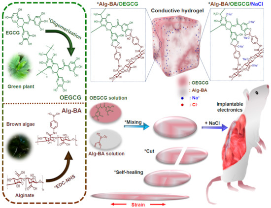 In this study, a natural conductive hydrogel is proposed based on “boronic acid-modified alginate” (Alg-BA) [] and “oligomerized epigallocatechin-gallate” (OEGCG) [] for a soft IE platform (Figure 1). The attributes of the boronic acid-cis-diol dynamic covalent bond include stretchability and self-healing []. To improve the conductivity without trading off the stretchability and self-healing properties, a simple but efficient method was introduced that involves soaking in a sodium chloride solution. Furthermore, a compatibility test and electromyogram (EMG) analysis [,] were implemented to test the applicability of this conductive hydrogel. This strategy for fabricating a conductive hydrogel with a natural polymer and increasing the conductivity by adopting a salt solution can be useful for improving the IE platform.