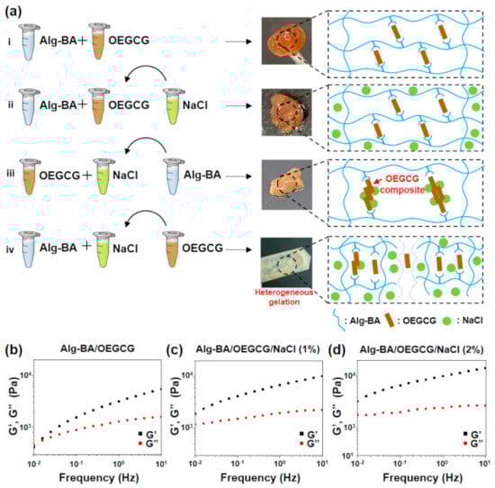 Conditions of gelation and mechanical characterization of Alg-BA/OEGCG/NaCl hydrogel. (a) Schematic illustration of the condition of gelation with varying sequences of mixing the components Alg-BA, OEGCG, and NaCl, and the schematic presentation of the mechanism of the bonding of components (right side), and (b–d) frequency sweep—storage (G’) and loss (G”) moduli at 2% strain, 25 °C: Alg-BA (2%)/OEGCG (b), Alg-BA (2%)/OEGCG/NaCl (1%) (c), and Alg-BA (2%)/OEGCG/NaCl (2%) (d).