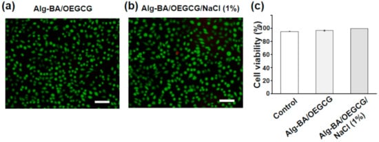 Viability of Alg-BA/OEGCG/NaCl hydrogel: (a,b) representative live/dead staining images of L929 cells after treatment with transwell Alg-BA/OEGCG (a) and Alg-BA/OEGCG/NaCl (1%) (b) after 24 h incubation at 37 °C. Living cells appear green, dead cells appear red. Scale bars: 100 μm. (c) Cell viability of control (95.4%), Alg-BA/OEGCG (96.9%), and Alg-BA/OEGCG/NaCl (1%) (99.7%): the error bars represent the standard deviations (n = 3).