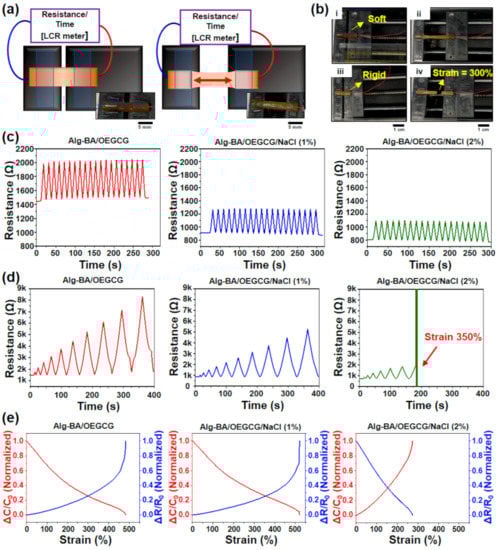 Resistance–strain cyclic test of different Alg-BA/OEGCG/NaCl conductive hydrogels to analyze the electrical-mechanical characterizations. (a,b) Illustration and photograph of resistance–strain test with automatic stretch-testing machine (LCR (Inductance/Capacitance/Resistance) meter). Alg-BA/OEGCG/NaCl was lusterless and rigid (b, (iii) and (iv)) compared with Alg-BA/OEGCG (b, (i) and (ii)) and only strained near 300%. (c,d) Resistance–strain cycle tests (10 cycles) from 0 to 100% (c) and strain increased strains (50% per time) from 50 to 500% (d). (e) Strain–normalized conductivity and resistance continuous strain to each conductive hydrogel—without NaCl (left), NaCl (1%) (middle), and NaCl (2%) (right). Each cyclic loading/unloading was performed continuously.
