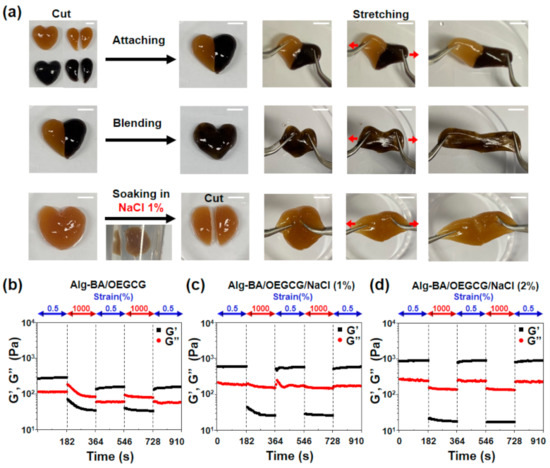 The self-healing property of the Alg-BA/OEGCG hydrogel was confirmed by cutting the surfaces and attaching the cut surfaces to each other. First, a heart-shaped hydrogel which was not soaked in 1% NaCl solution was cut and attached, and then it was pulled to both sides. The hydrogel was blended completely and pulled to both sides. After soaking in 1% NaCl solution for 1 min, the hydrogel was also cut and attached to each cut surface and pulled to both sides.