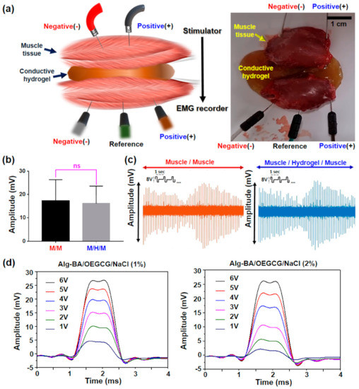 To verify the performance of Alg-BA/OEGCG/NaCl conductive hydrogel as an IE platform, an ex vivo muscle defect model was set up using rat hind limb muscles (12-week-old, male) labeled as ‘distal muscle’ and ‘proximal muscle’. Two muscle tissues were freshly dissected and spaced with a distance of 4 mm and the hydrogel was filled in the space. One proximal muscle was electrically stimulated by waveform generator (Arbitrary, 1 Channel, 20 MHz, 33511B, Keysight Technologies, Inc., Santa Rosa, CA, USA). The EMG signals were recorded in another distal muscle by biosignal amplifier (Bio Amp FE231, AD instruments, Sydney, Australia) and the data acquisition device (PowerLab 8/35, AD instruments). Action potential signals were filtered on the authority of the ISEK (International Society of Electrophysiology and Kinesiology) standard (1500 Hz low-pass). As a control, a direct contact muscle-to-muscle model was prepared without a space between two muscles.