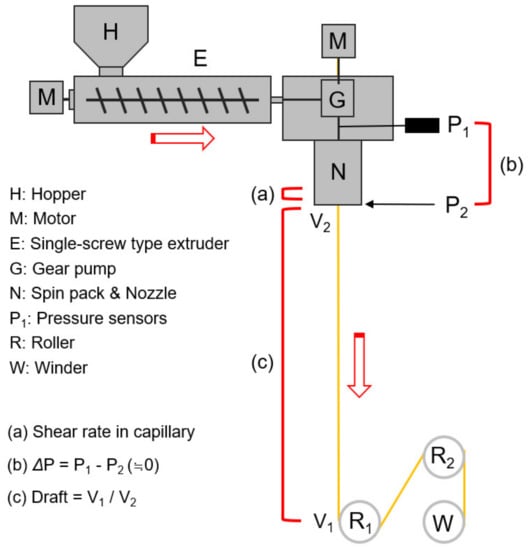 where Qv and Qm are the volumetric and mass flow rate of the polymer, respectively; r0 is the radius of the hole (capillary); V1 and V2 are the take-up velocity and throughput rate, respectively; Hn is the spinneret hole number; D is the hole diameter of the spinneret (r0 = D/2); ρ is the melt density (≈1.30) of the TLCP, estimated using a precise metering gear pump in the spinning process.
