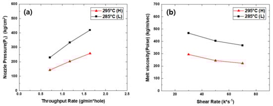 Relationship between (a) nozzle pressure (P1) and throughput rate and between (b) melt viscosity (poise) and shear rate for the TLCP resin in the spinning nozzle hole at the different spinning temperatures of 285 and 295 °C.