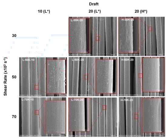 SEM images of the surface of the TLCP as-spun fibers obtained at various spinning conditions. L* and H* indicate the spinning temperatures of 285 and 295 °C, respectively.