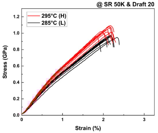 Variation of stress-stain curves of the as-spun TLCP fibers, prepared at the shear rate of 50,000 s−1 and the draft of 20, by the change in spinning temperatures (285 and 295 °C).
