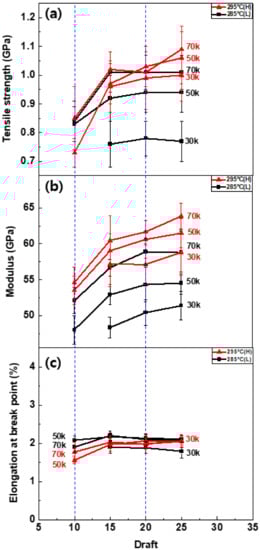 At a spinning temperature of 295 °C, the tensile strength (Figure 5a) increased steeply as the draft increased from 10 to 15 and, then, increased slowly or remained similar as the draft increased further. The tensile strength also tended to increase as the shear rate increased. Thus, the highest tensile strength of approximately 1.1 GPa was observed for the fiber obtained under the maximum shear rate (70,000 s−1) and draft (25) conditions. The tensile strength of the as-spun fibers obtained at the low spinning temperature of 285 °C showed a similar tendency. However, the tensile strength was much lower at the low shear rate of 30,000 s−1, and the curves shifted more obviously toward higher values as the shear rate increased compared with the curves of the fibers obtained at the higher spinning temperature.
