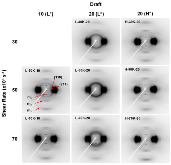 Two-dimensional WAXD patterns of as-spun TLCP fibers obtained at various spinning conditions. L* and H* indicate the spinning temperatures of 285 and 295 °C, respectively.