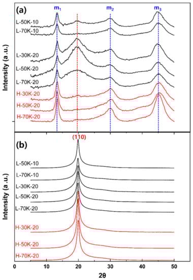 It is worth noting that another broad peak was observed at 2θ ≈ 19.6° on the meridional intensity profiles of all the L-30K/50K/70K-20 as-spun fibers, which were obtained at the high draft of 20 and low spinning temperature of 285 °C. The peak positions of the broad peaks almost corresponded to the Bragg’s angle of the equatorial (110) peak, indicating that a small fraction of non-oriented polycrystalline domains representing the (110) peak exists in the fibers.