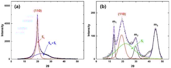 To investigate the structural development of the as-spun TLCP fibers according to the spinning conditions, their 2D-WAXD patterns were analyzed in detail. Figure 8a,b shows the peak deconvolution of the equatorial and meridional intensity profiles of the L-50K-20 as-spun fibers using Gaussian–Lorenz fitting []. The equatorial intensity profile could be deconvoluted with the sharp crystalline peak of (110) at 2θ ≈ 19.8° and the broad peak at 2θ ≈ 22.8°, and we supposed that the extracted broad peak was produced by the non-crystalline phase consisting of the highly oriented anisotropic and non-oriented isotropic phases in the as-spun fibers. On the contrary, the meridional profile was well fitted with the three meridional peaks of m1, m2 and m3 at 2θ ≈ 13.3, 29.6 and 45.0°, respectively, as well as the non-oriented polycrystalline domains of (110) at 2θ ≈ 19.6°, if an additional weak broad peak (Si) was assumed at 2θ ≈ 22.7°. It is supposed that this additional broad peak was produced due to the non-crystalline isotropic (non-oriented) phase in the fibers, as the peak could be detected in all azimuthal directions, and the peak position almost corresponded with that of the equatorial broad peak of the non-crystalline phase.
