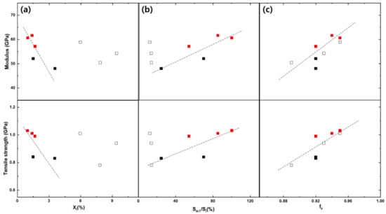 Relationship between the mechanical properties and the structural data ((a) the fraction of non-crystalline isotropic phase (Xi), (b) area ratio (Sm1/Si) and (c) crystalline orientation factor (fc)) analyzed from the 2D-WAXD patterns of the as-spun fibers (■: L-50K/70K-10, □: L-30K/50K/70K-20, ■: H-30K/50K/70K-20).