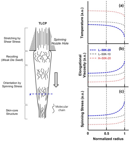 Figure 10 shows the variation of profiles of temperature, elongational viscosity and stress in the cross-section of TLCP fibers at the distance of approximately 15 cm from the nozzle in the spin-line by the change in the spinning conditions, calculated with the simulation models [] and Equation (12). The data of temperature dependence specific heat and elongational viscosity of the TLCP fibers in the spin-line for the calculation were assumed with references [] and [,]. The calculated profiles indicated that if the shear rate in the nozzle hole (i.e., throughput rate and hole diameter) was constant at 50,000 s−1, their distributions in the cross-section of the fiber showed a tendency to increase as the draft (i.e., spinning velocity) increased from 10 to 20 and the spinning temperature decreased from 295 to 285 °C. These results are assumed to be attributed to the influence of radial velocity element Vr, increased with the cooling effect at the skin part in the fibers.