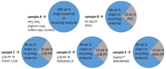 Two different isotactic PP homopolymers were used for the study, which were supplied by Borealis (Vienna, Austria). The type of HD 601CF (PP3; MFR value of 8 g/10 min at 230 °C and 2.16 kg) is normally used as film resin for chill roll processes and the second virgin PP, HF 700SA (PP4; MFR value of 21 g/10 min) can be used for different injection molding applications. Additionally, three different PP were collected from household post-consumer waste, which consisting of flakes from coffee caps (MFR = 14.3 g/10 min), which was supplied by Walter Kunststoffe GmbH (Wels, Austria), flakes of yoghurt cups (thermoformed PP; MFR = 5.3 g/10 min) and flakes of buckets (injection-molded PP; MFR = 31.9 g/10 min). The yoghurt cups and buckets were self-collected.