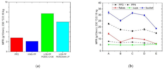 Figure 2a shows the MFR values of the blending materials, which amounted for PP2 = 2.8 g/10 min, LCB-PP modified by PODIC C126 = 7.7 g/10 min, LCB-PP modified by PEROXAN LP = 6.0 g/10 min. Figure 2b represents the MFR values of all materials after the extrusion temperature of 240 °C. It can be clearly seen that the use of blends reduces the MFR values. In particular, for the starting materials with a high MFR value such as PP4 (virgin granulate) but also for the flakes or bucket a reduction is visible. For the two materials with a lower MFR value (PP3 and cups) a slight reduction or at least keeping the values constant can be observed. However, as these values do not increase due to the addition of LCB-PP, which show a higher MFR than cups, it can be assumed that the mixing rule is not the reason for the reduction of the MFR values.
