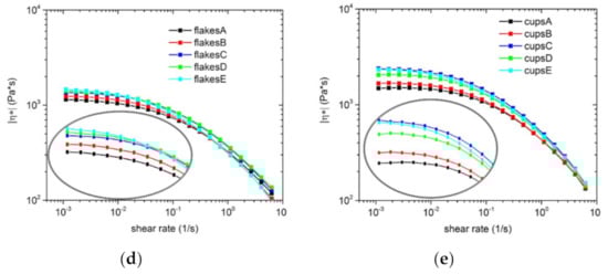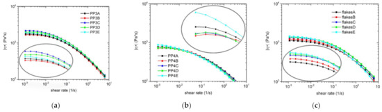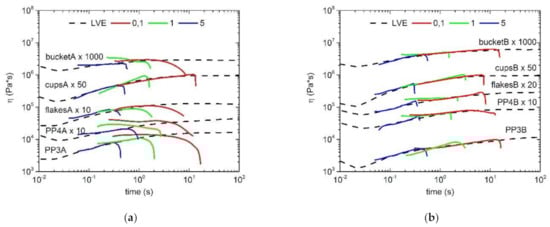 Rheology measurements have been shown in literature to be a good tool of identifying molecular structures and to be very sensitive to changes in them [36,57,58,59,60,61,62,63,64]. Several studies have investigated the rheological behavior of blends with linear PP and branched PP or PE and have shown that these blends have a higher shear thinning effect or strain hardening compared to linear PP [47,48,49,65]. The Figure 3 show the viscosity curves, which were measured at 230 °C to achieve better comparability with the MFR values, of the respective virgin materials and the blends. The viscosity curves of the respective materials are very close to each other, so these curves were additionally plotted larger in the low shear range in order to get a better overview. For the series with lower MFR (PP3, flakes and cups) it was found that the use of LCB-PPs or HMS-PP resulted in a pronounced increase in viscosity. While the blends with L-PP only achieved a slight increase in viscosity for the recycled materials, the curve progression of virgin granules could only be kept constant. No clear trends could be observed for the two series with higher MFR (PP4 and buckets). On the one hand, no changes between the individual viscosity curves are clearly visible in the PP4 series blends and on the other hand, an opposite trend could be observed in the recycled bucket and its blends compared to the other recyclates. In this case, the blend with L-PP shows an increase in the viscosity curve, whereas the blends with LCB-PPs and HMS-PP show a small reduction.
