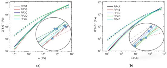 In addition to the complex viscosity, the storage modulus (G′) and the loss modulus (G″) are important parameters in dynamic rheology, which provide information about viscous or elastic effects depending on the shear rate [66,67]. In Figure 4 and Figure 5 the respective curves of the associated series are shown. For a better representation of the crossover points, this area of the curves was displayed larger and additionally the intersection points were marked with a star for each graph. Figure 4 shows the curves of the two virgin materials PP3 (a) and PP4 (b) and their blends. If both pictures are compared, it becomes clear that the curves and the cross points of G′ and G″ are shifted from PP4 to higher frequencies, which is attributable to the high MFR values. As the curves are so close to each other in nearly all cases and the crossing point of G′ and G″ partly overlap, the respective values are given in Table 1.