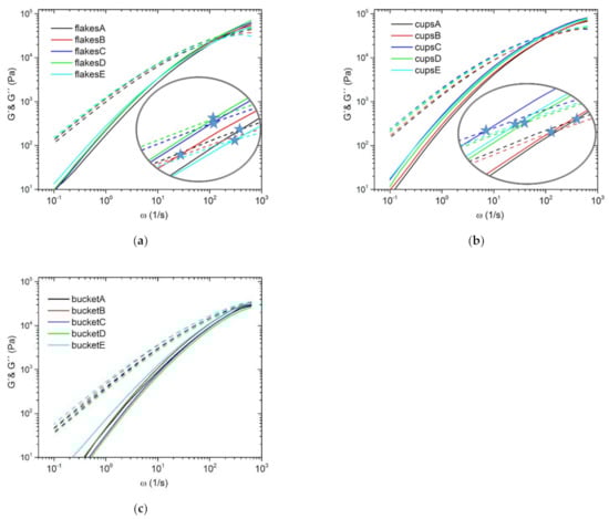 Figure 5 additionally shows the series of recyclates (flakes (a), cups (b) and bucket (c)). Comparing the different recyclates with each other, the difference between the crossing points of G′ and G″ is even more pronounced. It can be seen that with increasing MFR value the crossing point shifts to higher frequencies. This is most pronounced with the bucket. Here no intersection point could be determined under the given measurement conditions because it was outside the measurement range. However, the values of the crossing points of the other two series (flakes and cups) are also listed additionally in Table 1.