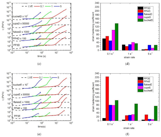 It is known that extensional rheology plays an important role in the detection of long-chain branching and the associated changes in molecular structure [74,75,76,77]. It has been shown in various studies that the melt strength, which is also referred to as strain hardening, can be increased compared to linear PP [78,79,80,81,82]. The increased melt strength of materials is very important and desired for many manufacturing processes such as thermoforming, film casting, film blowing, foaming, and so on [83,84].
