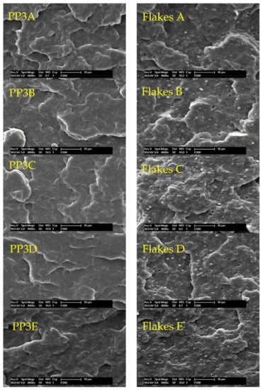 A morphological difference between the two starting materials PP3 and flakes of coffee caps can be seen clearly. It can be observed that the recycled post-consumer material (flakesA) already has some polymeric particles in the fracture surface. However, no changes could be detected through the blending process with L-PP (flakesB), LCB-PP on basis of PODIC C126 (flakesC), LCB-PP on basis of PEROXAN LP (flakesD) or HMS-PP (flakesE). This means that no additional particle formation in the morphological structure was recognizable and therefore the blends used did not play a role in the miscibility of the recycled material. This in turn means that there is no phase segregation at the 10 wt.% blend content used and it is, therefore, very easy to process.