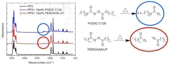 The branching mechanism of PODIC C126 and PEROXAN LP was examined by using FTIR. It is well known in the literature that the modification or branching with different components such as HDDA (1,6-hexanediol diacrylate) or MAH (maleic anhydride) by using FTIR can be demonstrated clearly [37,59,90,91]. Figure 11 shows the FTIR spectra of the unmodified PP and the two LCB-PPs each modified with 10 wt.% peroxide. The two modified PPs show an absorption band at 1743 cm−1 compared to the unmodified PP. This band describes the stretching vibration of a carbonyl group of an ester, which is generated by the introduction of long-chain branching and the use of peroxides [25,92,93].