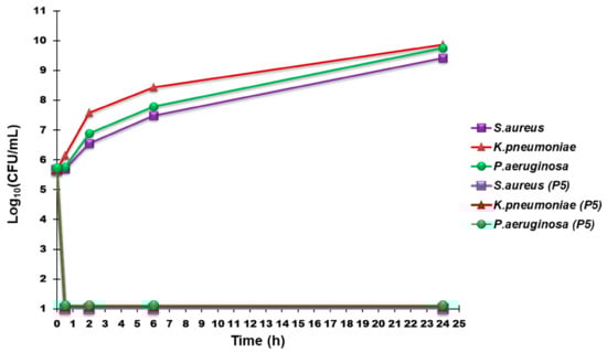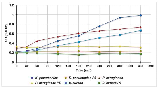 3.6.4. Effect of P5 on the Growth Curve of P. aeruginosa, K. pneumoniae, and S. aureus