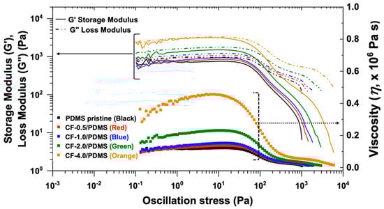 We selected 0.5, 1, 2, and 4 wt.% CF filler in PDMS to compare with PDMS pristine as a control sample. As shown in Figure 1, the solid-like property (G’: storage modulus) of CF-4.0/PDMS is very close to the liquid-like property (G”: loss modulus) (G’ ≈ G”), even with a significant increase in the viscosity. This demonstrates that 4 wt.% CF filler in PDMS is too thick, indicating that it is not appropriate for material fabrication processes requiring low viscosity materials. In addition, shear thickening behavior, where G’ increases with increasing oscillation stress, has not been observed, which indicates the CF fillers are well dispersed in the PDMS matrix without filler clustering/rearrangement [36].