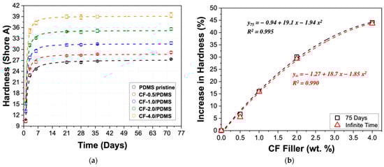 Each data set was fit using a logistic curve and shows good agreement with all CF loadings—all R2 values are greater than 0.985. Using the fits shown in Figure 3a, the hardness at infinite time were calculated for all samples: 27.2 ± 0.5, 28.7 ± 0.4, 31.5 ± 0.3, 35.2 ± 0.4, and 39.1 ± 0.2 were determined for PDMS pristine, CF-0.5/PDMS, CF-1.0/PDMS, CF-2.0/PDMS, and CF-4.0/PDMS, respectively. Dow reports the Shore A hardness of Sylgard™ 186 as 24 [40]. This difference can be explained by the curing conditions (humidity, temperature, etc.), which have been shown to have a significant effect on the final mechanical, thermal, and physical properties of PDMS [41,42,43]. Figure 3b shows the percentage increase in hardness when compared with PDMS pristine after 72 days (black squares) and at their ultimate hardness (hardness at infinite time, values given above; red triangles). The agreement between the black and red fits means that, despite continued crosslinking by the PDMS pristine and the CF-0.5/PDMS sample, the materials’ hardness can be confidently tuned within the given CF loadings for its extended use in various applications by applying the simple second degree polynomial equations shown in Figure 3b.