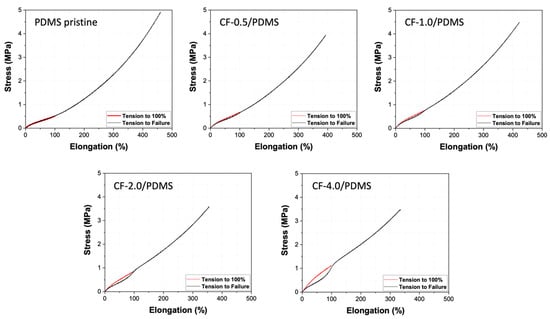 Stress-strain curves as a function of CF filler amount in PDMS matrix. Red curves show initial tension from 0% to 100%, and black curves show subsequent tension on the samples previously elongated to 100% until failure.