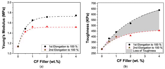 (a) Young’s Modulus and (b) toughness change as a function of the amount of CF filler. Young’s Modulus and toughness values are from the stress-strain curves of samples for the 1st trials (black circles; 1st elongation to 100%) and the 2nd trials (red triangle; 2nd elongation to 100%). The gray area is the loss of toughness.