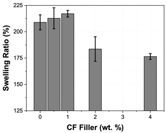 Swelling ratio (%) as a function of the amount of CF filler in the PDMS matrix.