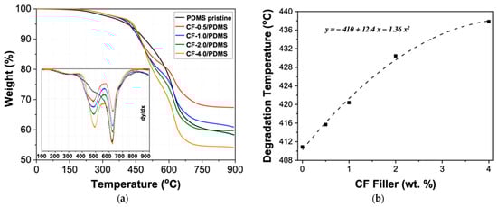 The thermal degradation behavior of the PDMS pristine and CF/PDMS samples was monitored using thermogravimetric analysis (TGA), as shown in Figure 7 and Table 2. The degradation exhibits three steps for all samples, which can be seen from the three peaks in the derivative graph in Figure 7a. Zhou and coworkers showed a similar degradation profile for PDMS. The first degradation is a slow degradation step at about 300 °C [50]. This degradation occurred before the degradation temperature (Td), denoted by a 5% weight loss, was reached, and we attribute this to the loss of small molecules or non-crosslinked polymer chains trapped in the polymer matrix. After this step, the samples reach their degradation temperatures. In Figure 7b, there is an increase in the degradation temperature with increasing CF content. Similar to the increase in hardness (Figure 3b), the increase in degradation temperature follows a second-degree polynomial equation, shown in Figure 7b, with high agreement (high R2 value = 0.991). Using this information, the thermal degradation of CF/PDMS can be tuned to meet the needs of specific applications.