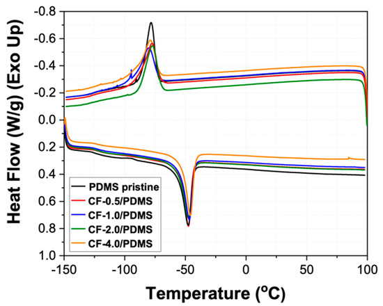 Differential scanning calorimetry curves for PDMS pristine and CF/PDMS samples.