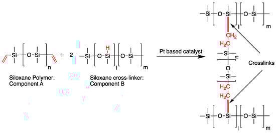 Hydrosilylation reaction between vinyl-terminated polydimethylsiloxane and methylhydrosiloxane-dimethylsiloxane copolymer [32,33]. Crosslinking occurs between the vinyl terminated group from Component A and the Si–H group from Component B in the presence of the Pt based catalyst. The chemical bonds active in crosslinking are shown in red, and the thick red line indicates the newly formed crosslinks.
