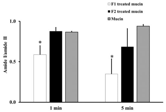 The amide I/amide II absorption ratios at room temperature (RT) for 1 and 5 min of F1-treated mucin (white), F2-treated mucin (black), and untreated mucin (gray). Experiments were performed in triplicate and repeated three times. Bars display mean ± S.D., * p < 0.05 compared with untreated mucin.