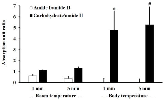 The amide I/amide II absorption unit ratio (white) and carbohydrate/amide II ratio (black) of F1-treated mucin/untreated mucin at body temperature (BT) and RT for 1 and 5 min. Experiments were performed in triplicate and repeated three times. Bars display mean ± S.D., * p < 0.05 compared to 1 min at RT, # p < 0.05 compared to 5 min at RT.