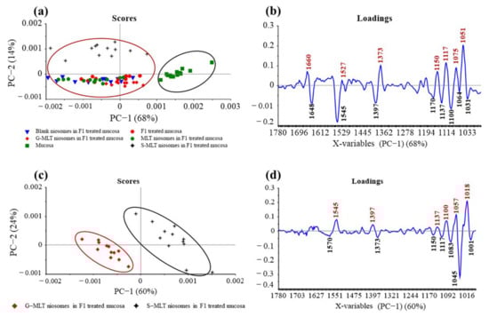 (a) Principal component (PC) plots and (b) loading plots of (●) F1, (▼) blank niosomes in F1, (●) MLT niosomes in F1, (✦) S-MLT niosomes in F1, and (◆) G-MLT niosomes in F1-treated mucosa compare to untreated mucosa (▪) at fingerprint region. (c) PC plots and (d) loading plots of (✦) S-MLT niosomes in F1-treated mucosa compared to (◆) G-MLT niosomes in F1-treated mucosa at fingerprint region.