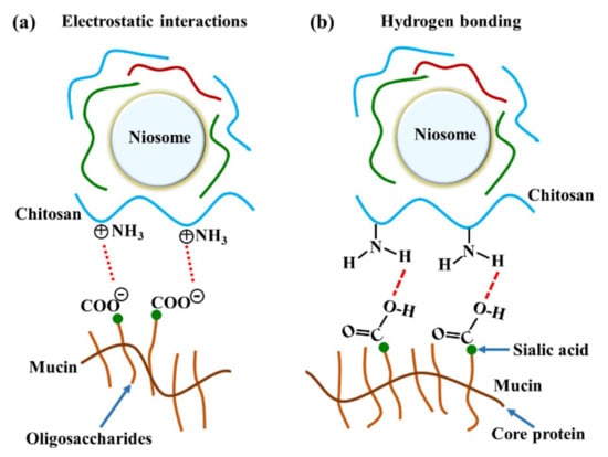 The illustration of chitosan and mucin interactions by (a) electrostatic interaction and (b) hydrogen bonding.