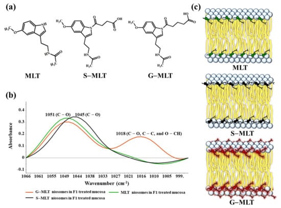 (a) The chemical structures of MLT, S-MLT, and G-MLT; (b) the ATR-FTIR spectra of MLT (green), S-MLT-(black), and G-MLT-(red) niosomes in F1-treated mucosa at wavenumber 1066–995 cm−1; (c) the schematic of MLT or its derivatives embedded in lipid bilayer of niosome.