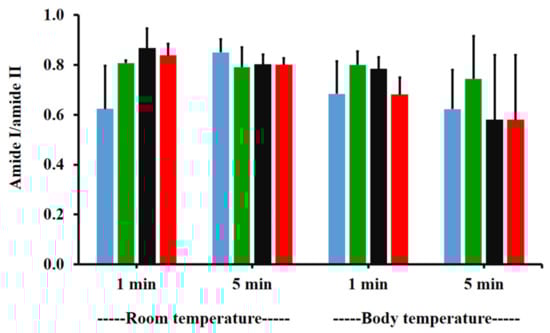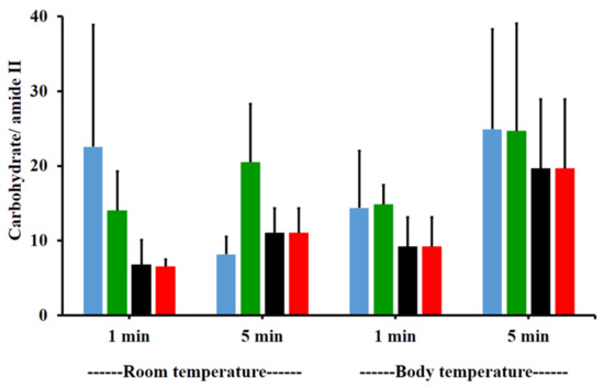 At RT, the F1-treated mucin/untreated mucin absorption ratio for amide I/amide II was less than one, with no significant difference between 1 and 5 min (p > 0.05), whereas the absorption unit ratio for carbohydrate/amide II was higher than one, with no significant difference between 1 and 5 min (p > 0.05).