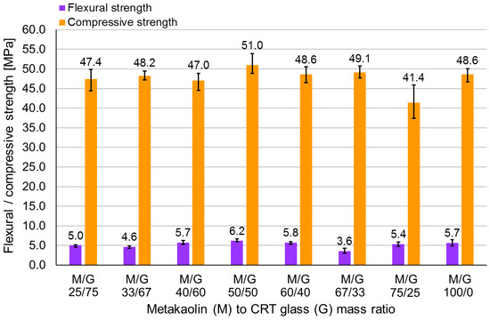 - No strict dependence between CRT glass content and geopolymer strength was observed. The obtained flexural strength ranged from 3.6 to 6.2 MPa (samples containing metakaolin-to-CRT-glass ratios of 2:1 and 1:1, respectively), while the compressive strength ranged from 41.4 to 51.0 MPa (metakaolin-to-CRT-glass ratios of 3:1 and 1:1, respectively).