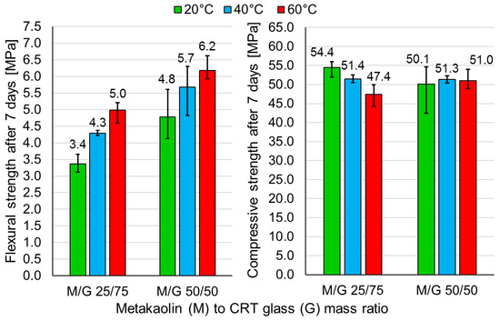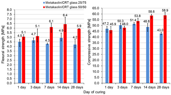 - The curing of samples for the first 24 h at 40 °C was decided as optimal due to the high strength and possibility of quick demolding. Samples containing a metakaolin-to-CRT-glass ratio of 1:3 achieved after 7 days a flexural strength of 4.3 MPa and a compressive strength of 51.4 MPa, while samples with an ingredients ratio of 1:1 obtained strengths equal to 5.7 MPa and 51.3 MPa, respectively. After just one day, the compressive strength of the geopolymer made out of both mixtures exceeded 45 MPa.