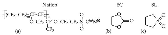 Structural formulas of Li-Nafion (where M+ is an exchangeable counterion) (a), ethylene carbonate (b), and sulfolane (c).