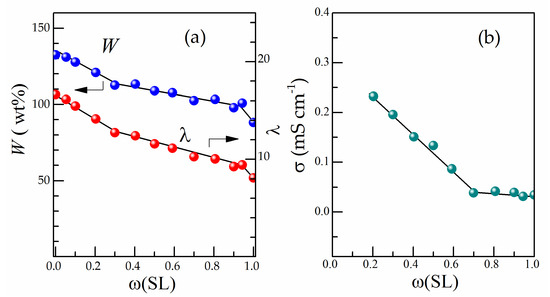 Weight uptake (W) and molar uptake (λ) (a) and conductivity of swollen Li-Nafion membrane at 25 °C (b) as a function of ω(SL) (mixing temperature of 40 °C).