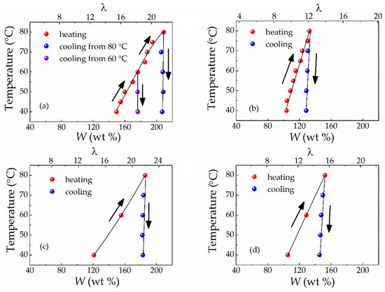Measurements of the W–T dependencies were carried out by sequential heating (40 to 80 °C with 10 °C steps) and cooling (80 to 40 °C with 20 °C steps). Figure 4 displays the results obtained. It can be seen that the mixing temperature has a powerful effect on the solvent uptake of Li-Nafion regardless of the plasticiser composition: the higher the mixing temperature, the greater the solvent uptake. However, this characteristic was observed only in the heating cycle (Figure 4); during the cooling cycle, the decrease in solvent uptake was barely noticeable. As a result, the W value obtained for the highest temperature was virtually maintained for all other annealing temperatures at the cooling mode for all plasticiser compositions studied (Figure 4). Upon cooling from 80 °C, the W value for this temperature was almost preserved after thermal treatment at 60 and 40 °C. If cooling was carried out from 60 °C, again, a similar W value was retained after thermal treatment at 40 °C (Figure 4a). At the end of measurements, long-term (60 days) isothermal treatment was carried out at 40 °C to check that the equilibrium state of the swollen samples during the cooling cycle was achieved. However, this procedure did not influence the obtained W values. This observation suggests either that the samples are close to the equilibrium state or that syneresis requires a very long time.