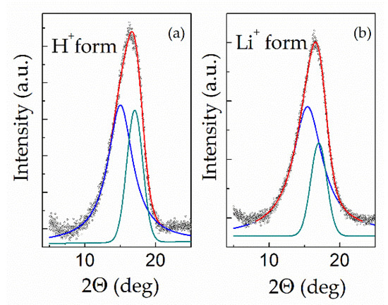In the present work, wide-angle X-ray diffraction was carried out as described in Section 2.5 for “dry” samples of Nafion 115 membrane in its H+ (as received) and Li+ forms in order to reveal the influence of the lithiation procedure (Section 2.1) on the degree of crystallinity and structural characteristics. Diffraction patterns of the samples in the 2θ range from 7 to 22° (where the most intensive peak is located) together with decomposed profiles are presented in Figure 5; their characteristics are shown in Table 1. For both samples, the measured curves were decomposed into a broad peak at 2θ ≈ 15° with a full width at half-maximum (fwhm) of ≈4° (amorphous halo), and a relatively sharp peak at 2θ ≈ 17° with fwhm of ≈2° (indexed as the (100) reflection of the hexagonal structure [35]). Taking into account the significant error in the decomposition of broadened profile, the WAXD results for H+ Nafion are in reasonable agreement with the literature data [1,25,35,36,37,38,39,40,41]. For lithiated Nafion, crystallographic data are extremely scarce (only Ref. [40] was found).