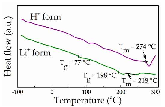 For Li-Nafion, the DSC curve shows a transition near 77 °C, which is close to that reported by the group of Changchun Institute of Applied Chemistry [49], along with a diffused double effect at 198 and 218 °C (Figure 6). However, the available data did not allow us to identify the double peak at 198 and 218 °C reliably. The latter effect’s temperature is close to the value reported in the literature for the α relaxation in lithiated PFSA [1]. However, it seems more likely that the effect at 218 °C is a weak endothermic peak related to crystallite melting, while the effect at 198 °C may be attributed to α relaxation. Although a double effect also observed by Ozerin et al. [46] for the protonated form of PFSA at 227 and 239 °C was attributed by the authors to crystalline melting, the reasons for its splitting were not discussed in the cited work. DSC curves for Na, K, Rb, and Cs Nafion salts presented by Almeida and Kawano [43] exhibit a very similar diffused double effect, with the higher value attributed by the authors to crystallite melting. Considering the literature data, we tend to attribute the transition at 218 °C to crystal melting. A likely explanation for the remarkable decrease in the temperature from 274 °C (protonated form) to 218 °C (Li-Nafion) (Figure 6) is a reduction in the average size of crystallites resulting from the lithiation procedure.