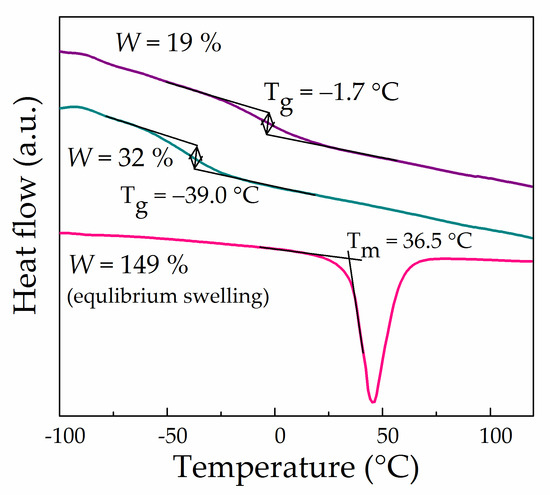 Figure 7 demonstrates DSC curves for Li-Nafion samples having different EC contents. It can be seen that the introduction of a relatively small quantity of EC (W = 19%) led to an abrupt decrease in the glass transition temperature from 77 °C of a dry membrane to −2 °C without phase separation. With an increase in W to 32%, the glass transition temperature shifted even more to the negative region to reach −39 °C. Here, it is likely that saturation with EC (W = 132%) shifts the glass transition temperature of the membrane to below −80 °C (not observed in this work), while the DSC curve shows only the endothermic effect of the first-order phase transition at 36.5 °C associated with the melting of ethylene carbonate released from the membrane upon cooling to 25 °C (Figure 7).