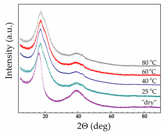 The WAXD results fully support the assumption of structural changes. For the study, we selected samples saturated with a mixed solvent EC/SL with ω(SL) = 0.2 at various mixing temperatures: 25, 40, 60, and 80 °C. (Mixtures with ω(SL) = 0.2 were used for membrane swelling instead of pure EC due to being entirely homogeneous at 25 °C according to the EC/SL phase diagram [31]). Figure 8 shows diffractograms of swollen membranes having a diverse thermal history in comparison with a dry membrane. The appearance of a new shoulder on the side of large angles at the most intense peak (100) can be clearly seen.